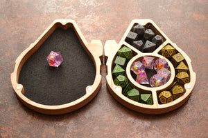 The interior is lined with colored felt, which provides a soft surface for your dice and protects them from damage. Thanks to the magnetic closure, the lid stays secure, making this box safe to carry to game nights, conventions, or travel. Inside, you’ll find four sections, allowing you to store and organize multiple dice sets with ease.
