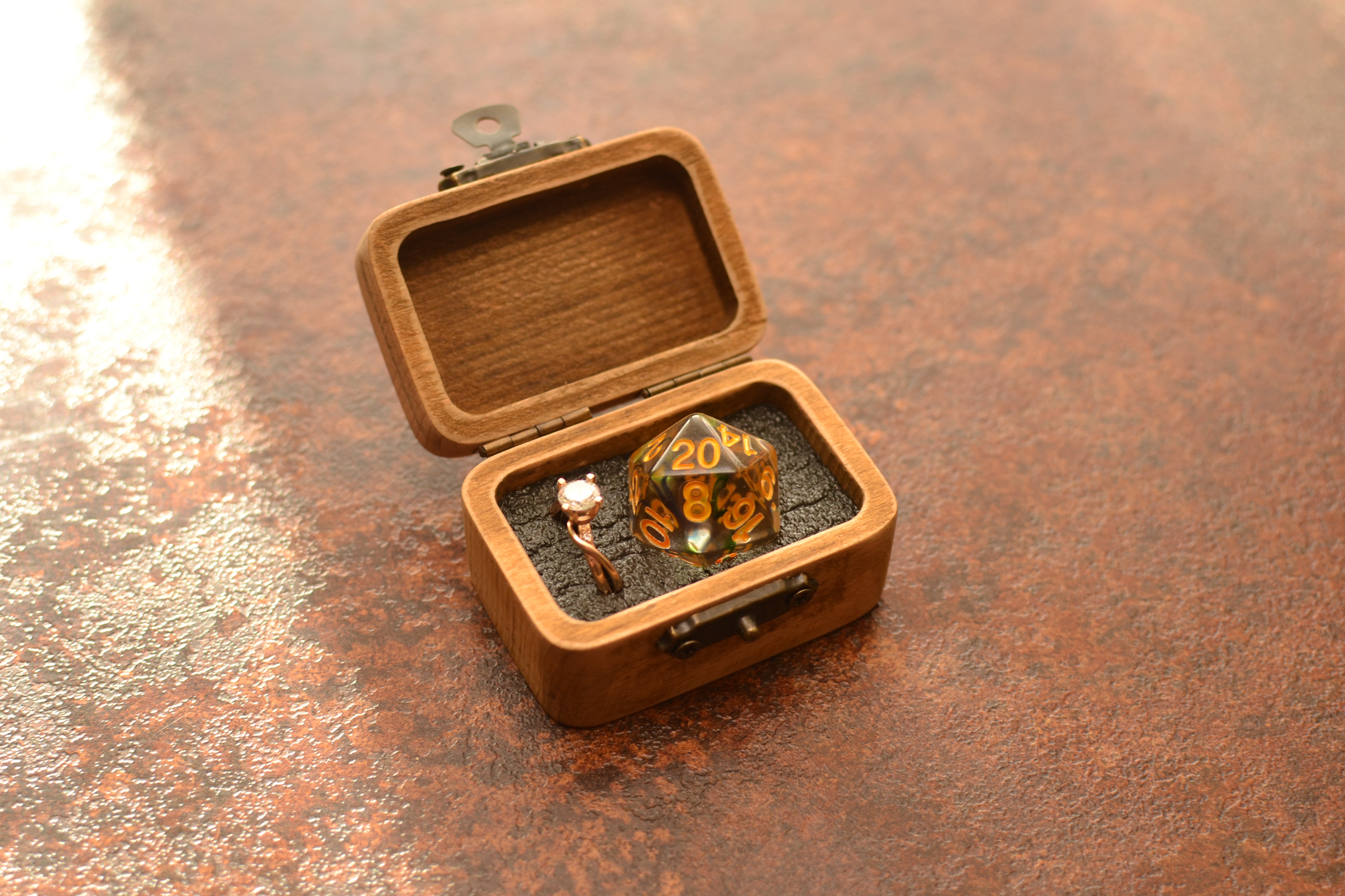 🎲 A compact walnut wooden dice box designed for mini metal dice collectors and tabletop RPG lovers. Perfect for carrying your favorite dice in style, gifting to a DnD fan, or adding to your dice storage collection.